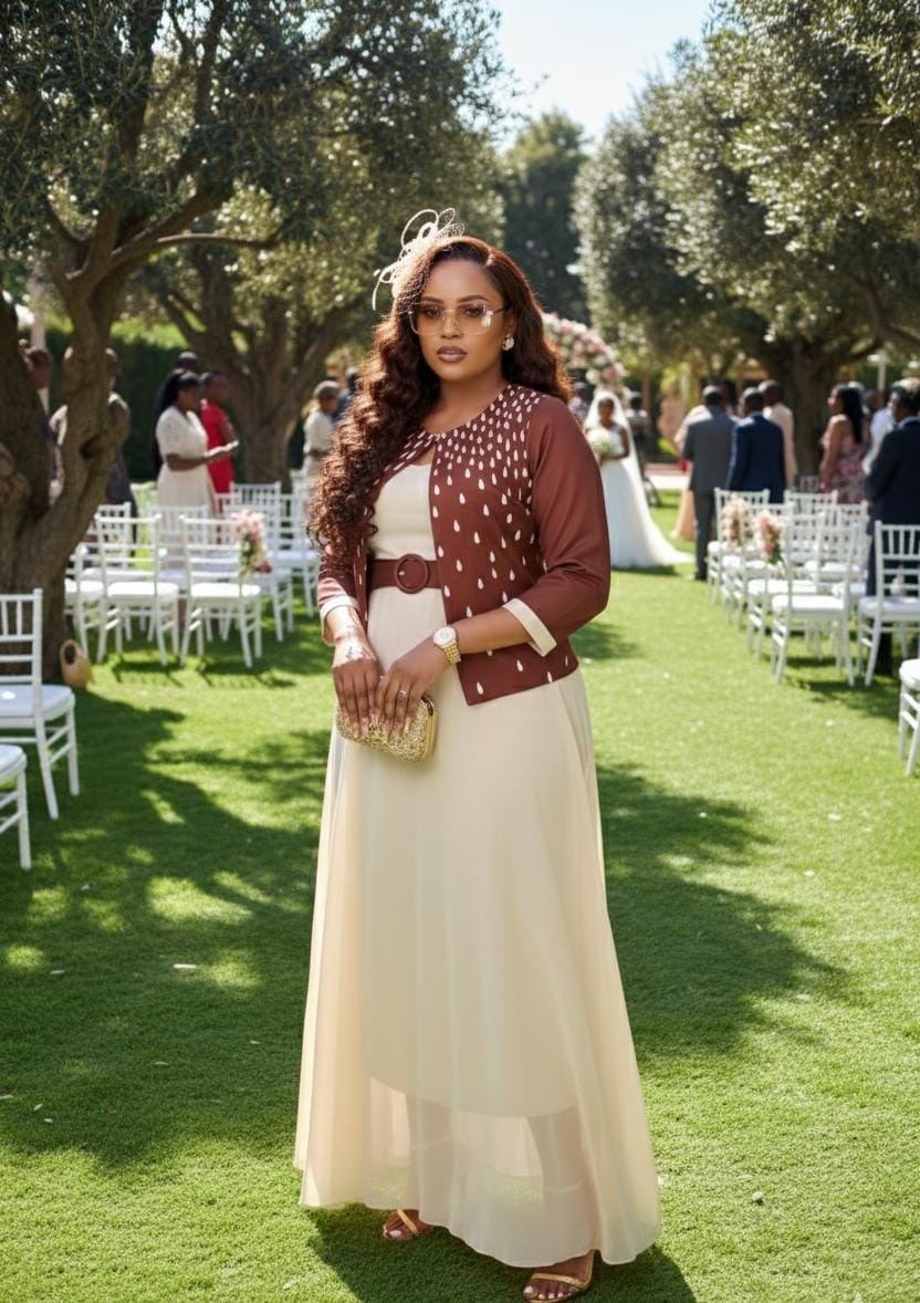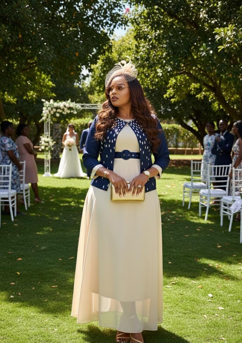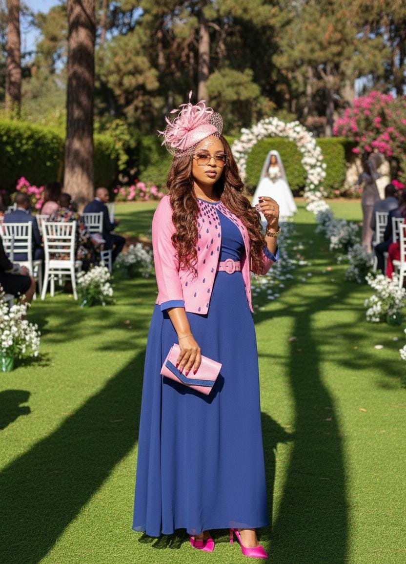 Elevate your formal wardrobe with this stunning two-piece set, combining a full-length pink Maxi dress with a chic navy blue cropped jacket/shrug.